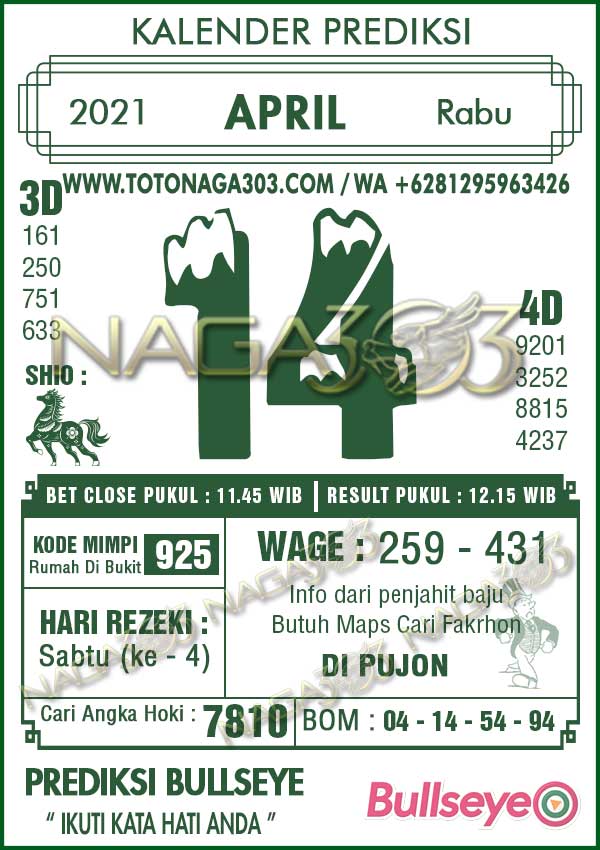 Prediksi Bullseye Rabu 14 April 2021 | Web Toto Naga303