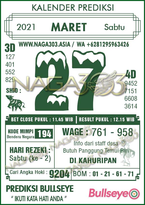 Prediksi Bullseye Sabtu 27 Maret 2021 | Web Toto Naga303