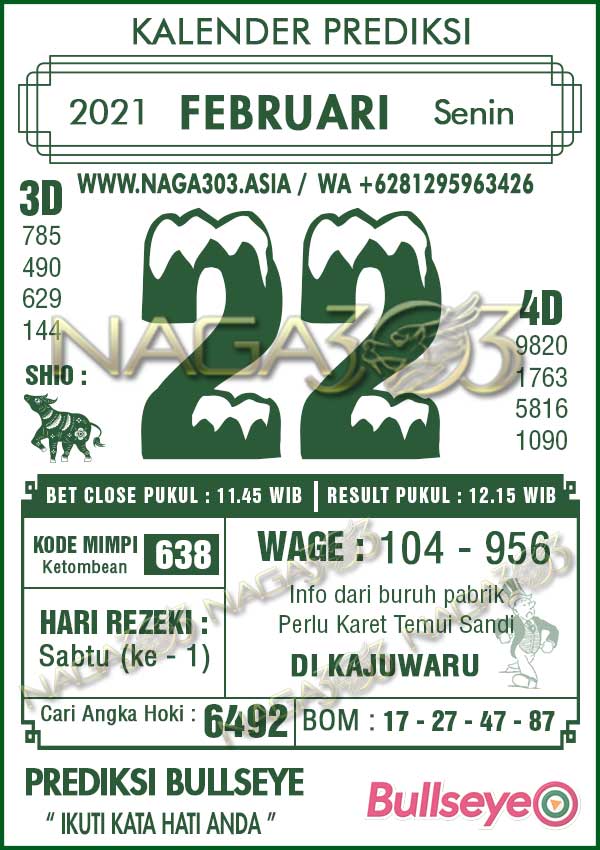 Prediksi Bullseye Senin 22 Februari 2021 | Web Toto Naga303