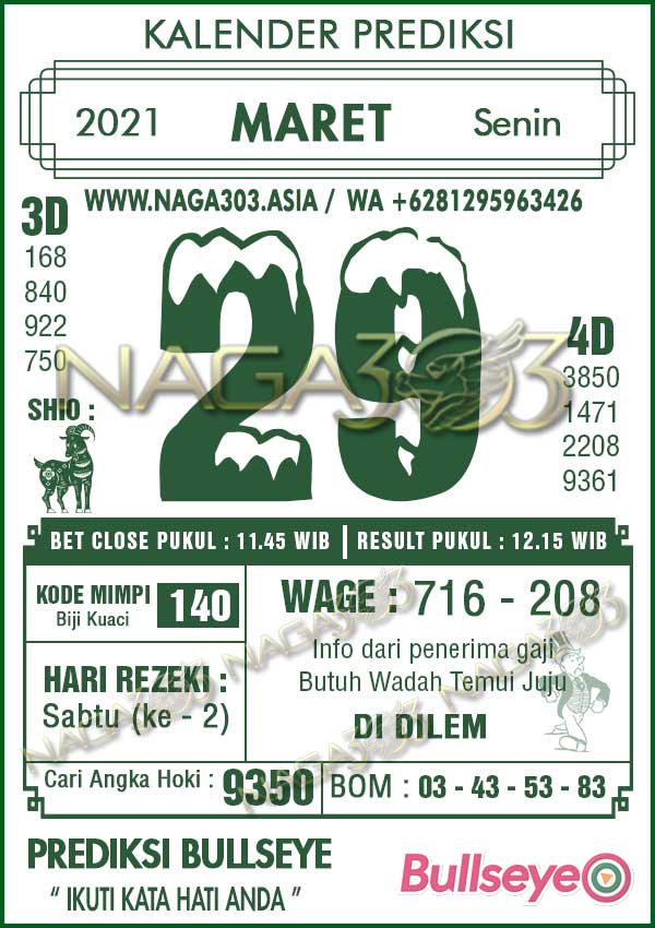 Prediksi Bullseye Senin 29 Maret 2021