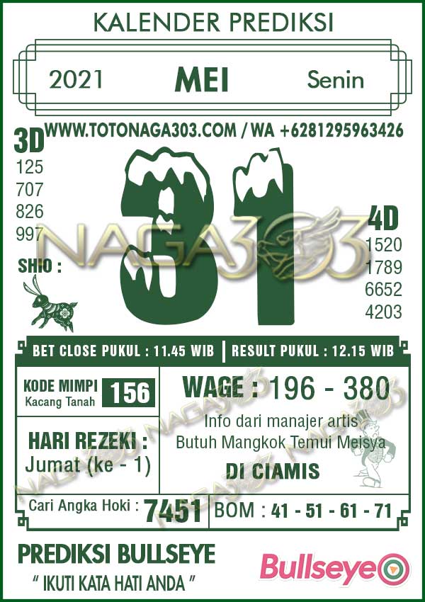 Prediksi Bullseye Senin 31 Mei 2021 | Web Toto Naga303