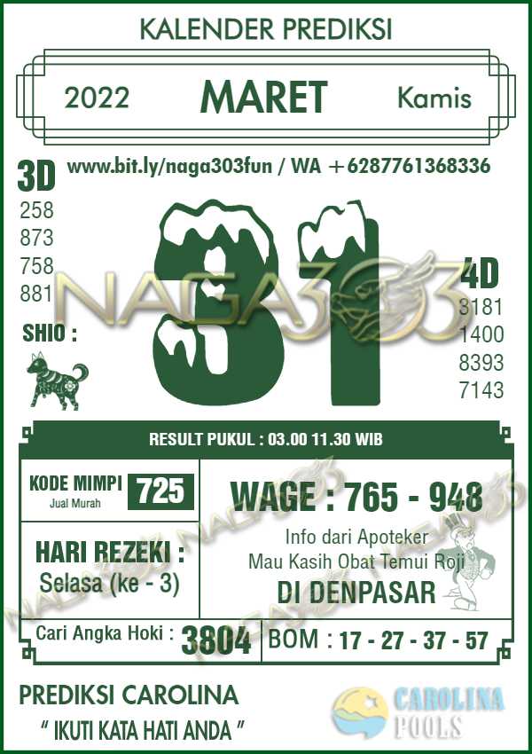 Prediksi Carolina Pools Kamis 31 Maret 2022 | Web Toto Naga303