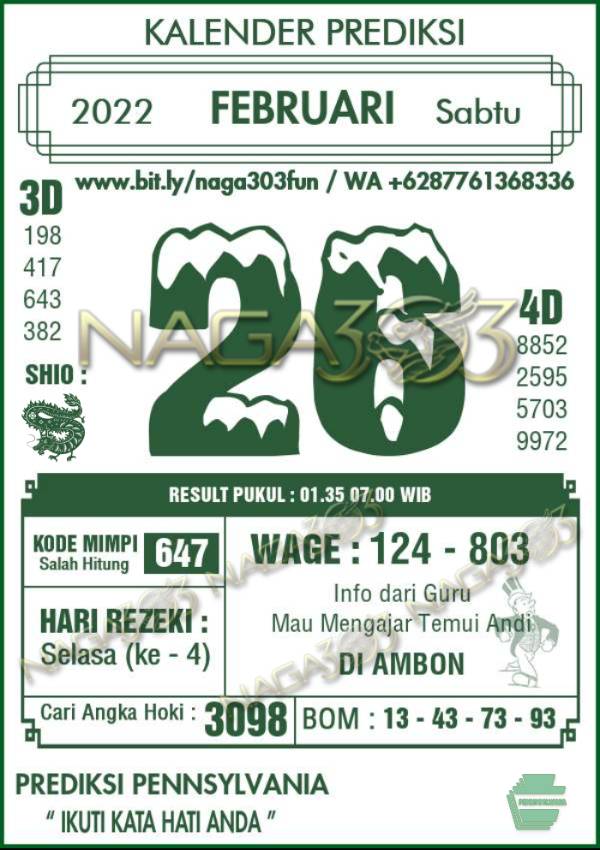 Prediksi Pennsylvania Pools Sabtu 26 Februari 2022 | Web Toto Naga303