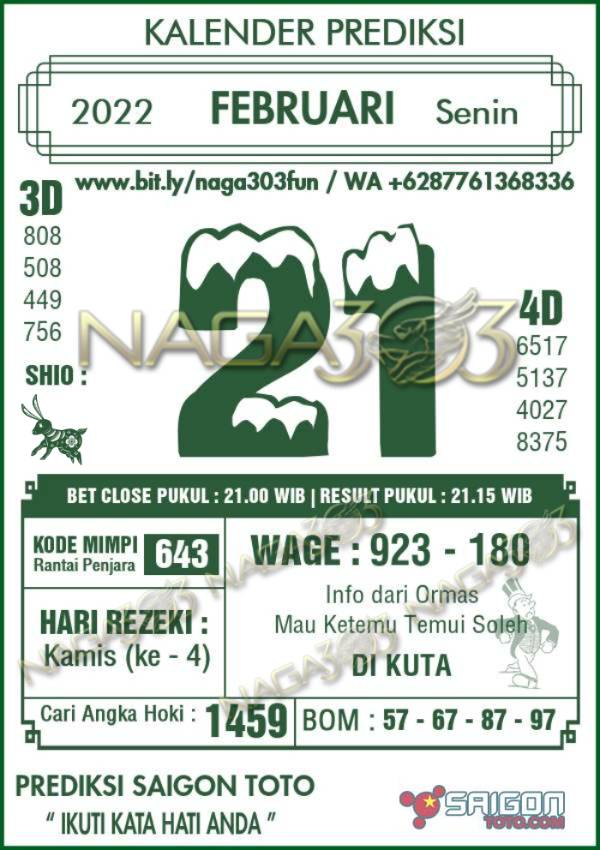 Prediksi Saigon Toto Senin 21 Februari 2022