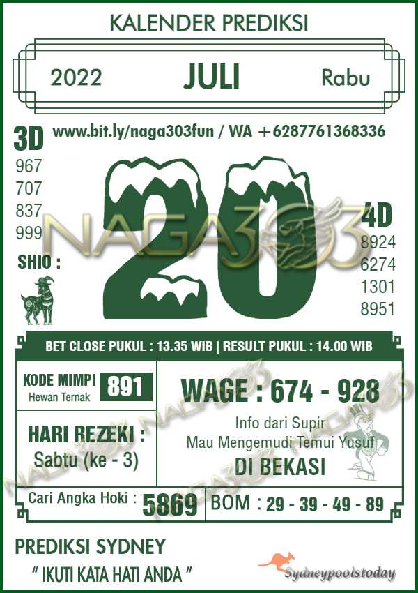 Prediksi Sydney Pools Rabu 20 Juli 2022 | Web Toto Naga303