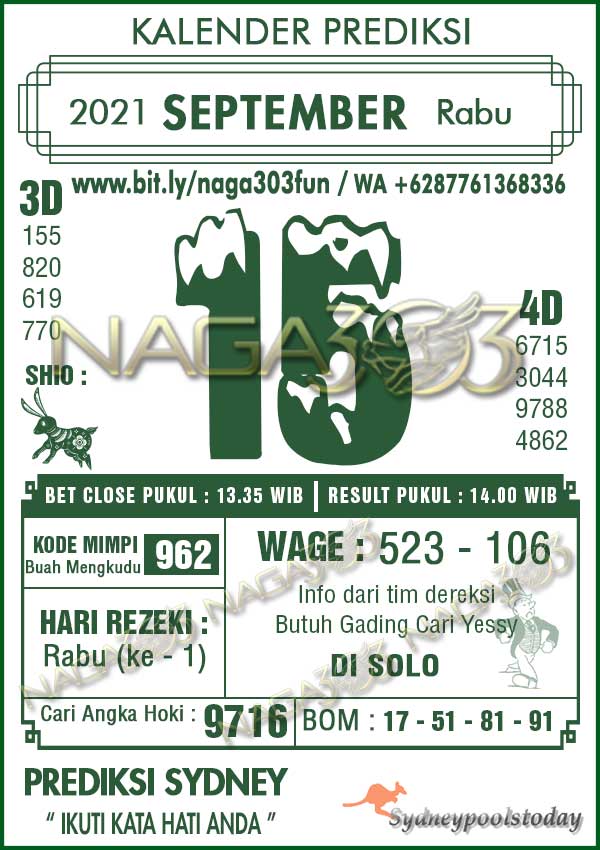 Prediksi SydneyPools Rabu 15 September 2021 | Web Toto Naga303