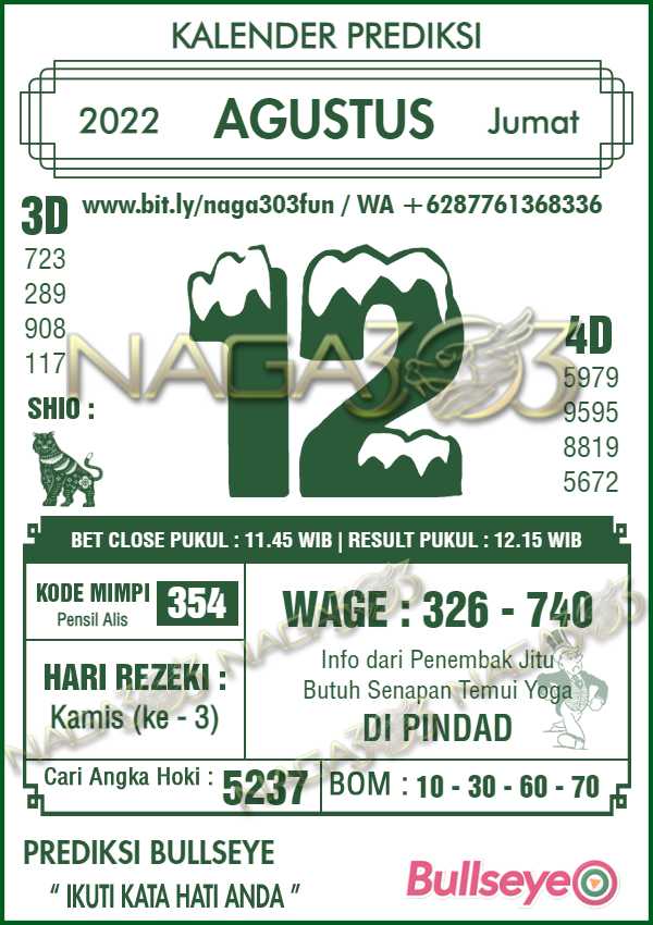 Prediksi Bullseye Jumat 12 Agustus 2022 | Web Toto Naga303