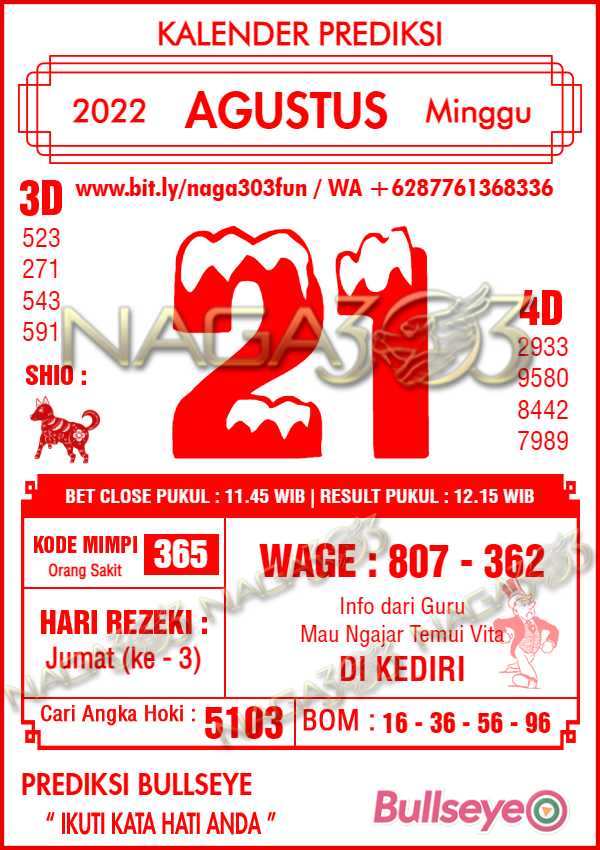 Prediksi Bullseye Minggu 21 Agustus 2022 | Web Toto Naga303