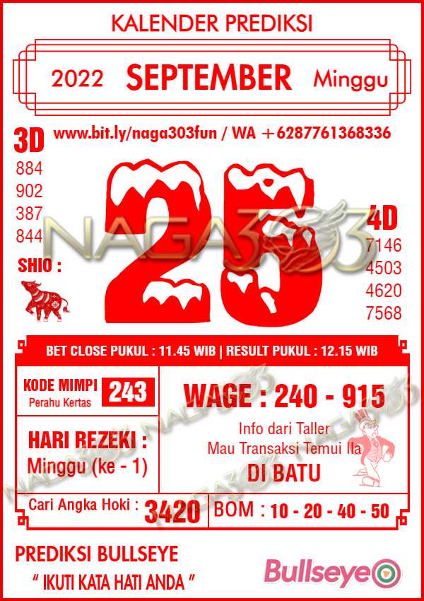 Prediksi Bullseye Minggu 25 September 2022 | Web Toto Naga303