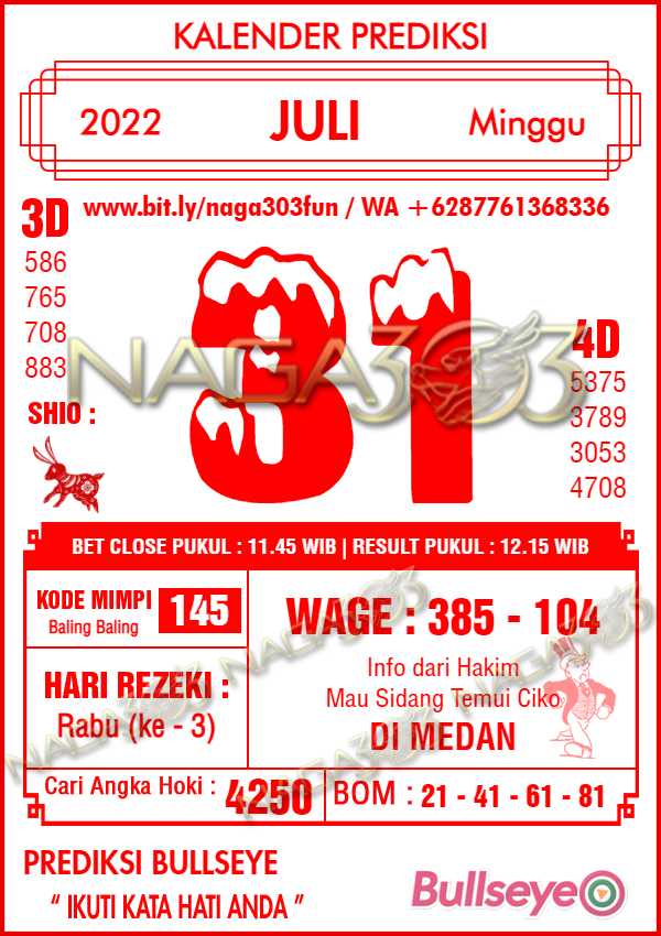 Prediksi Bullseye Minggu 31 Juli 2022 | Web Toto Naga303