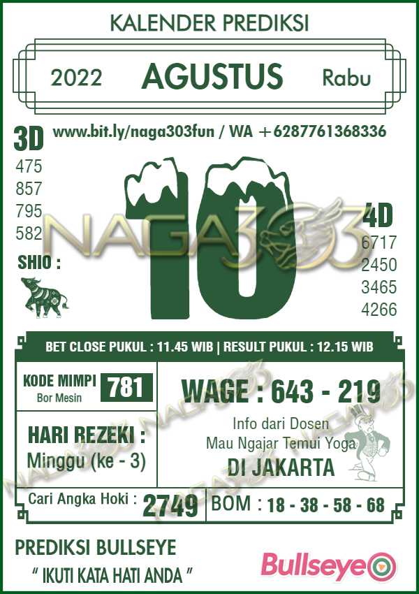 Prediksi Bullseye Rabu 10 Agustus 2022