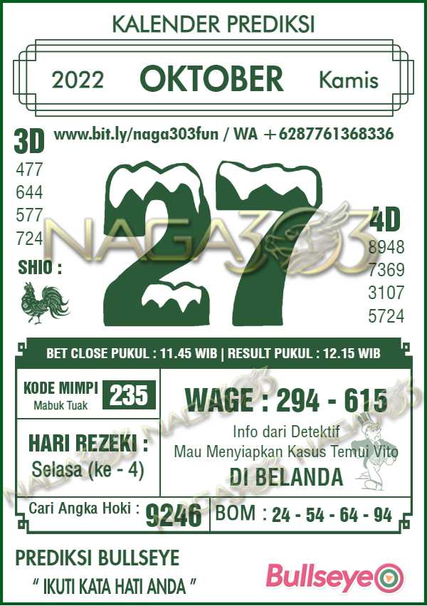 Prediksi Bullseye Rabu 27 Oktober 2022