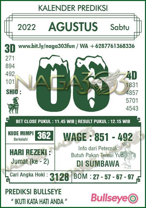 Prediksi Bullseye Sabtu 06 Agustus 2022