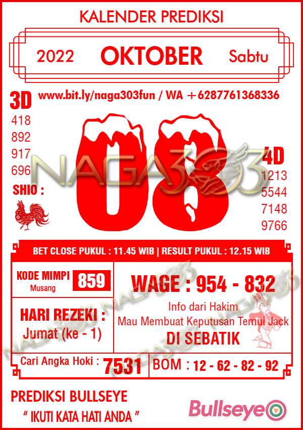 Prediksi Bullseye Sabtu 08 Oktober 2022 | Web Toto Naga303