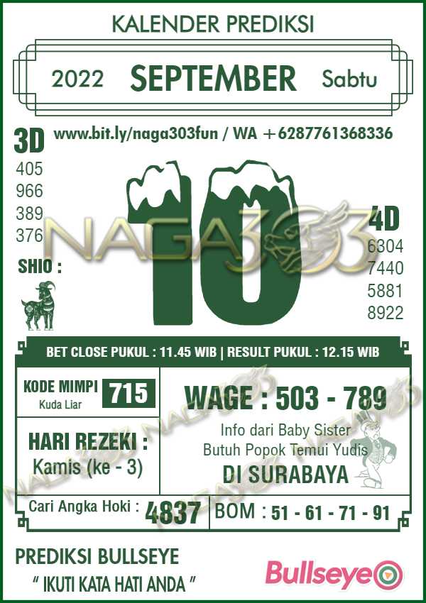 Prediksi Bullseye Sabtu 10 September 2022 | Web Toto Naga303