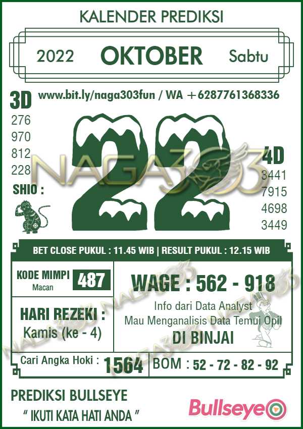 Prediksi Bullseye Sabtu 22 Oktober 2022