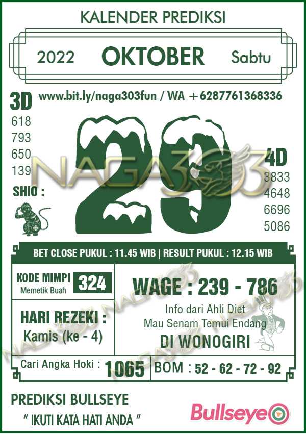 Prediksi Bullseye Sabtu 29 Oktober 2022