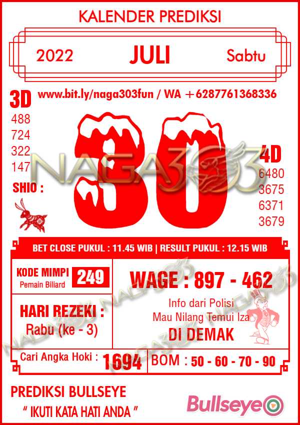 Prediksi Bullseye Sabtu 30 Juli 2022 | Web Toto Naga303