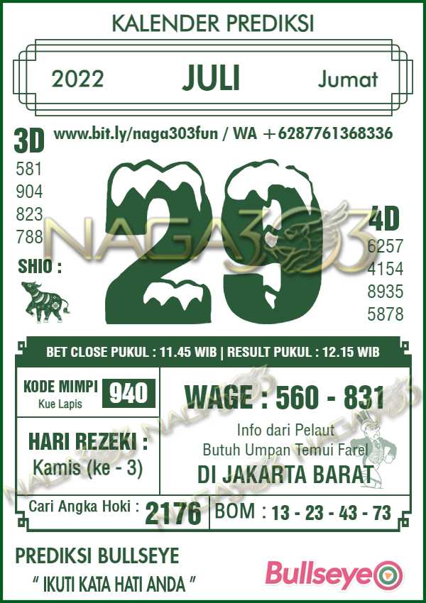 Prediksi Bullseye Sabtu 30 Juli 2022 | Web Toto Naga303