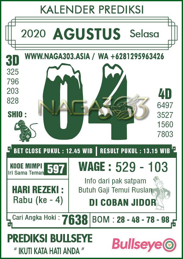 Prediksi Bullseye Selasa 04 Agustus 2020