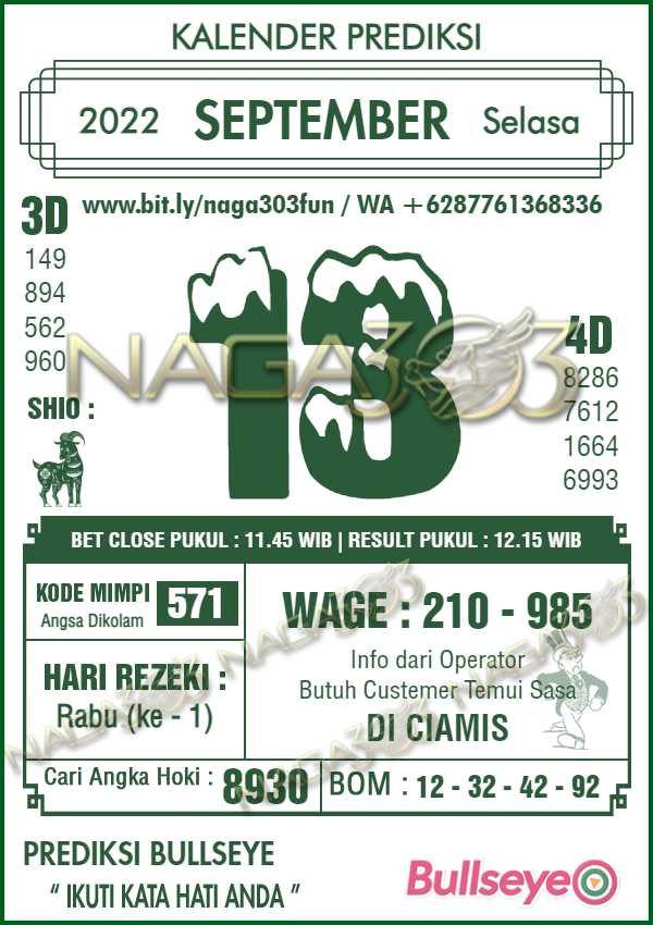 Prediksi Bullseye Selasa 13 September 2022 | Web Toto Naga303