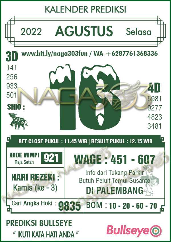Prediksi Bullseye Selasa 16 Agustus 2022 | Web Toto Naga303