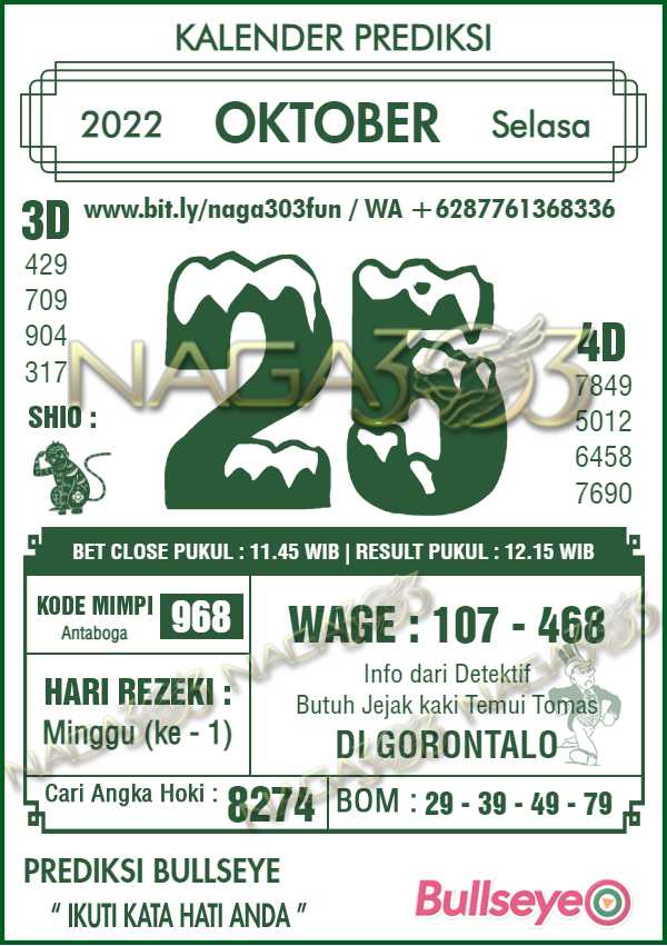 Prediksi Bullseye Selasa 25 Oktober 2022