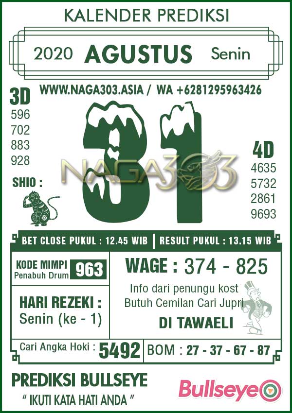 Prediksi Bullseye Senin 31 Agustus 2020 | Web Toto Naga303