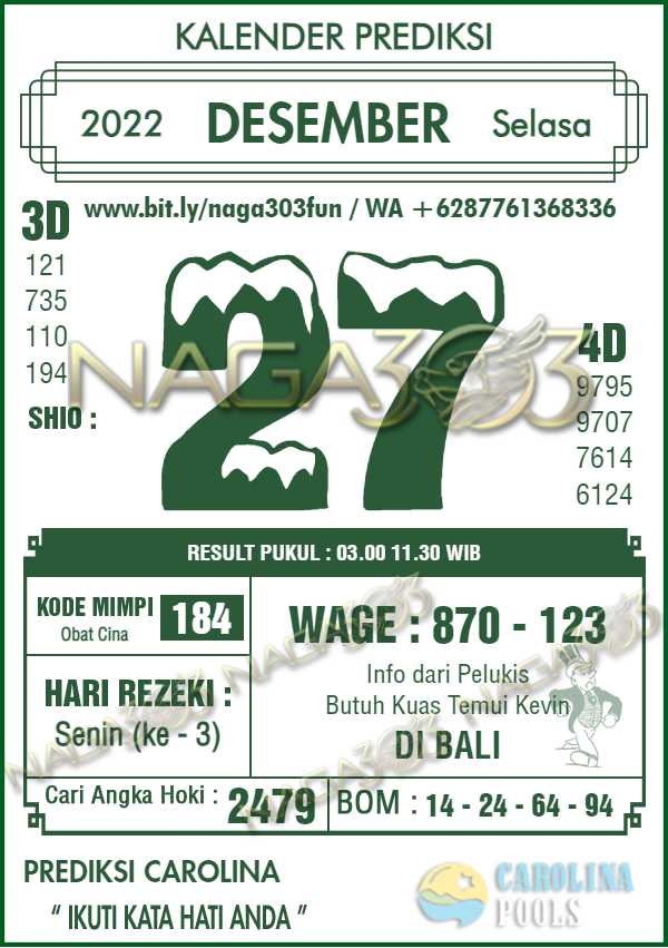 Prediksi Carolina Pools Selasa 27 Desember 2022 | Web Toto Naga303