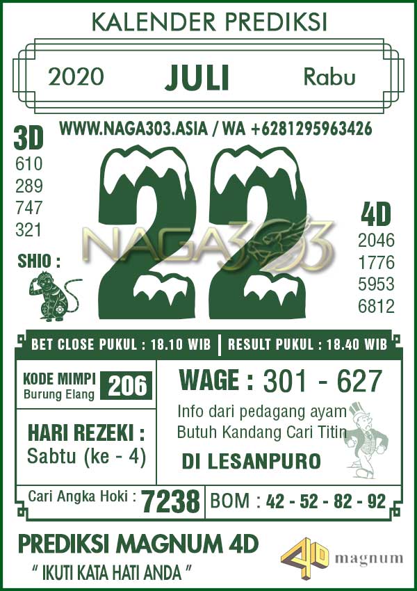 Prediksi Magnum 4D Rabu 22 Juli 2020 | Web Toto Naga303