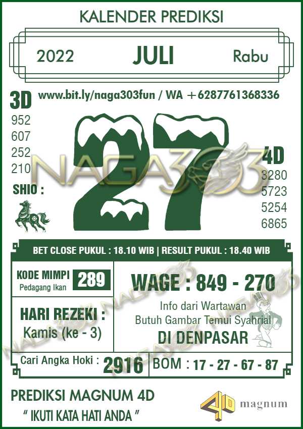 Prediksi Magnum 4D Rabu 27 Juli 2022 | Web Toto Naga303