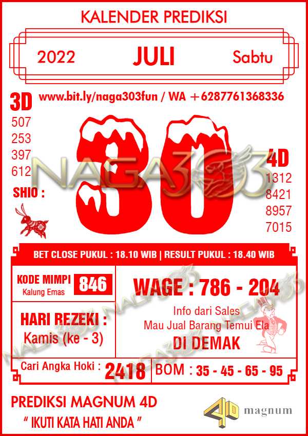 Prediksi Magnum 4D Sabtu 30 Juli 2022 | Web Toto Naga303