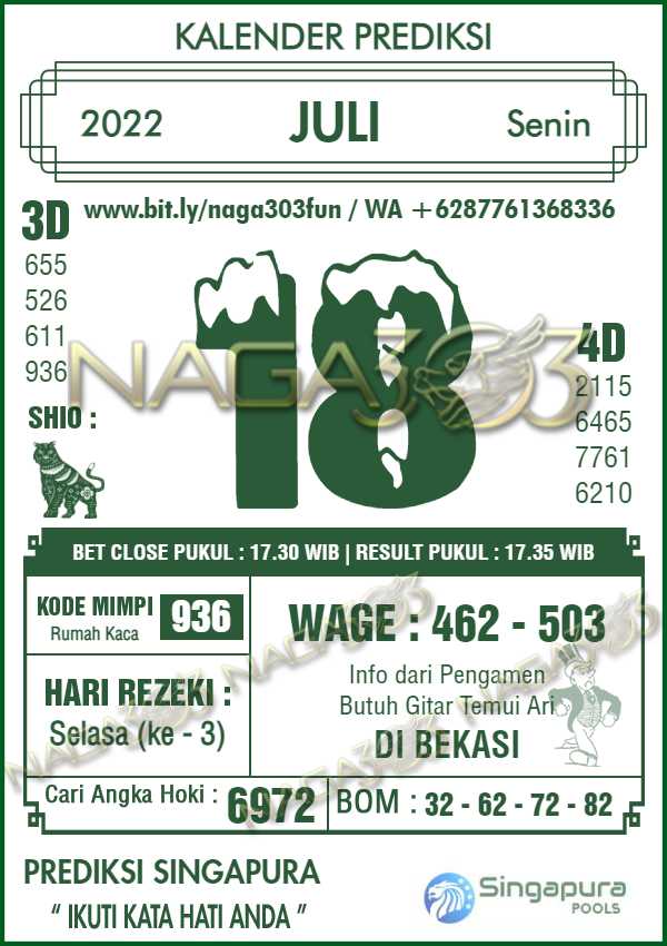 Prediksi Singapore Pools Senin 18 Juli 2022