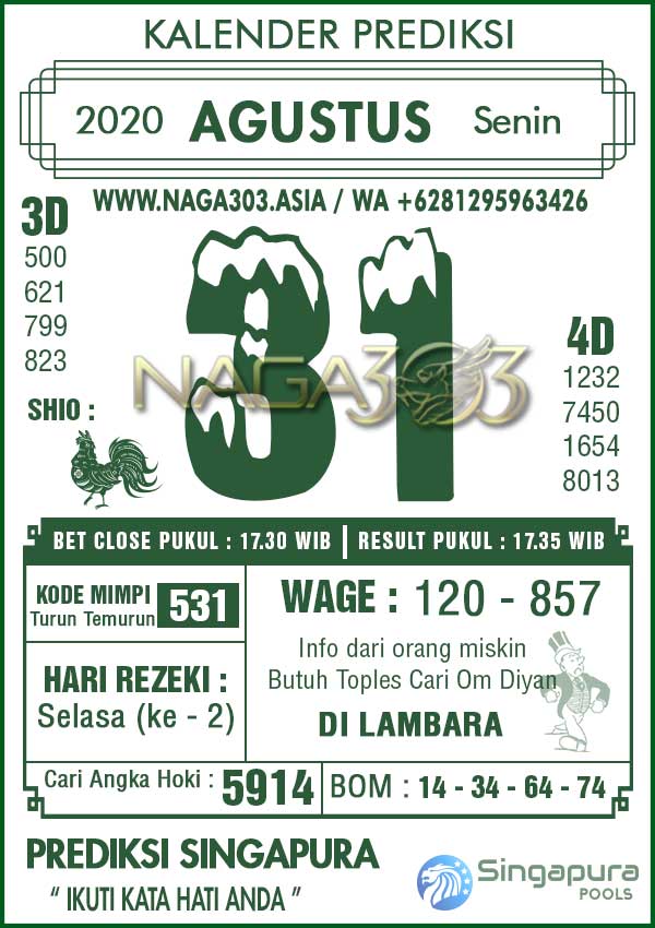 Prediksi Singapore Pools Senin 31 Agustus 2020
