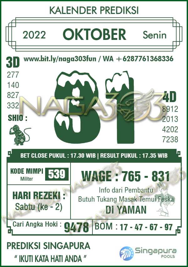 Prediksi Singapore Pools Senin 31 Oktober 2022