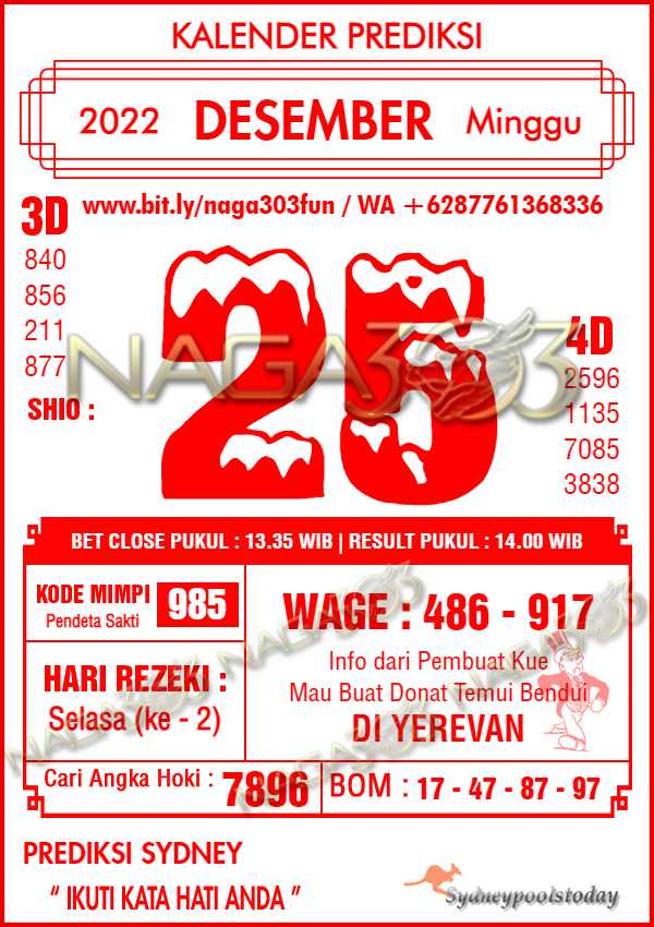 Prediksi Sydney Pools Minggu 25 Desember 2022